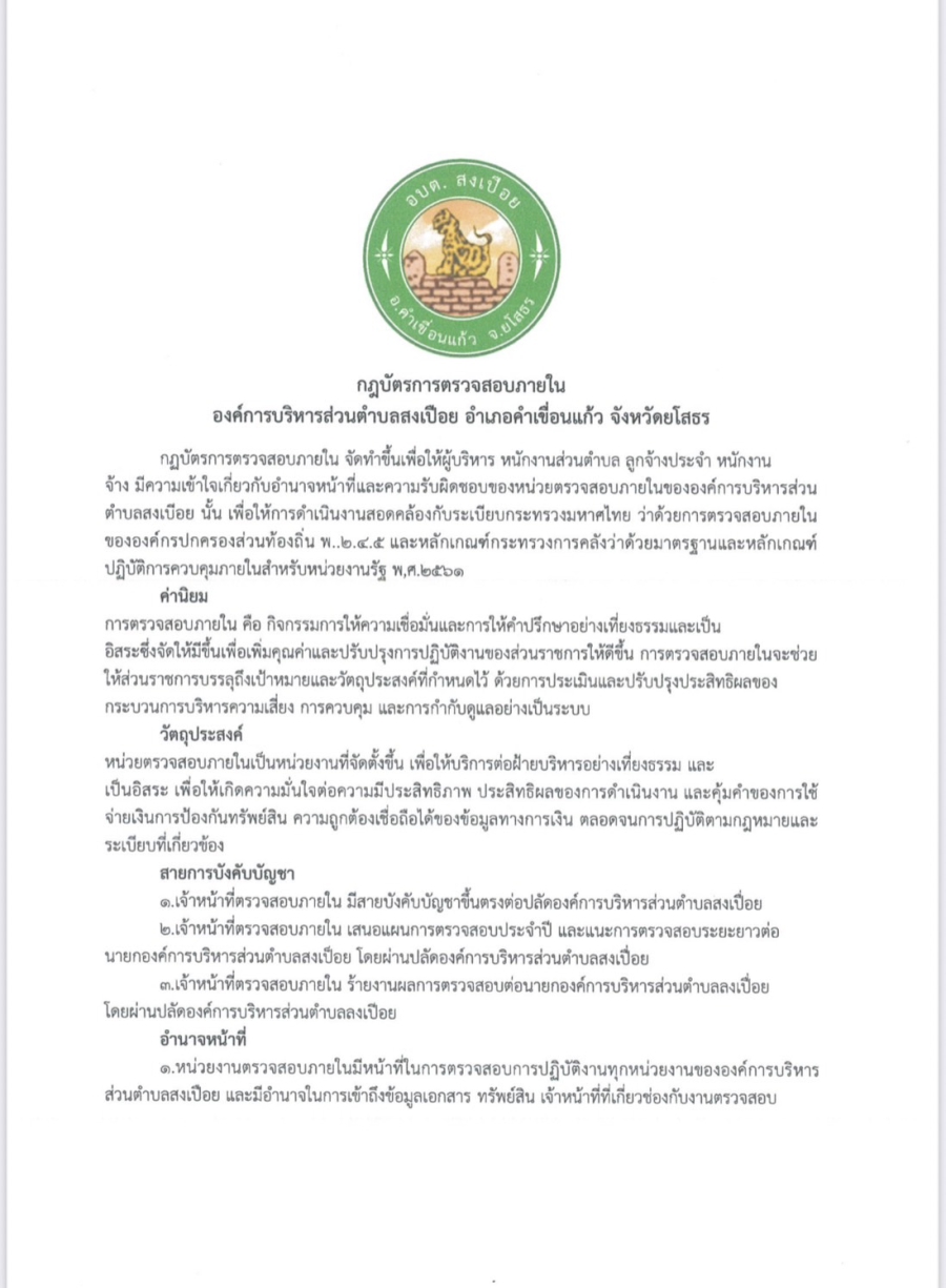 ตำบลสงเบีอย นั้น เพื่อให้การดำเนินงานสอดคล้องกับระเบียบกระทรวงมหาศไทย ว่าด้วยการตรวจสอบภายใน